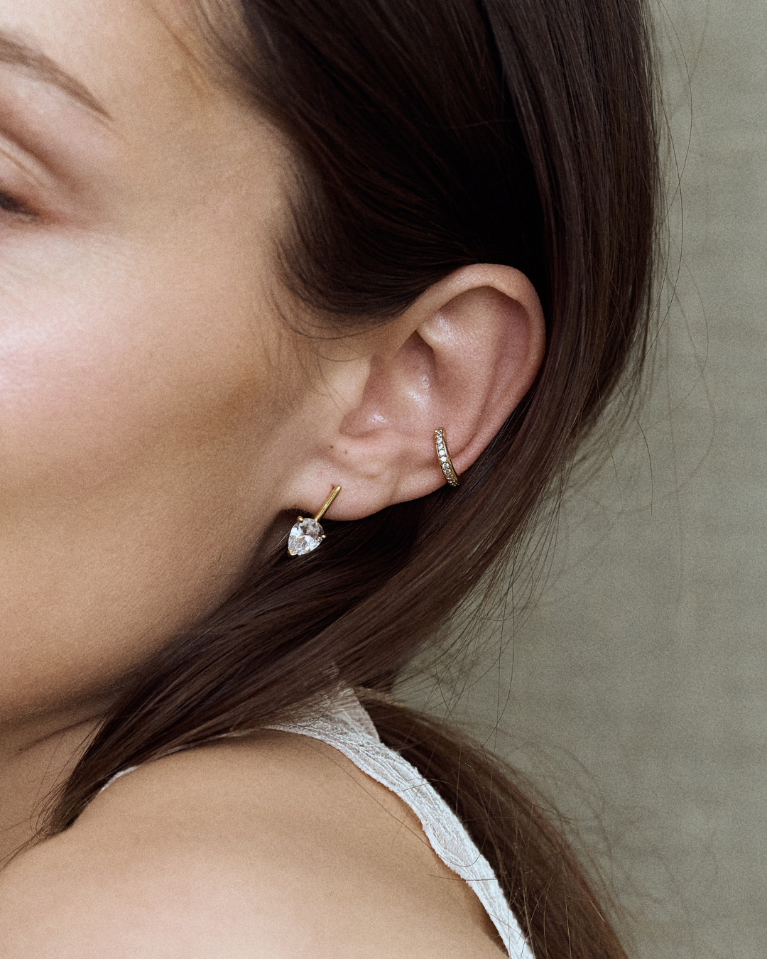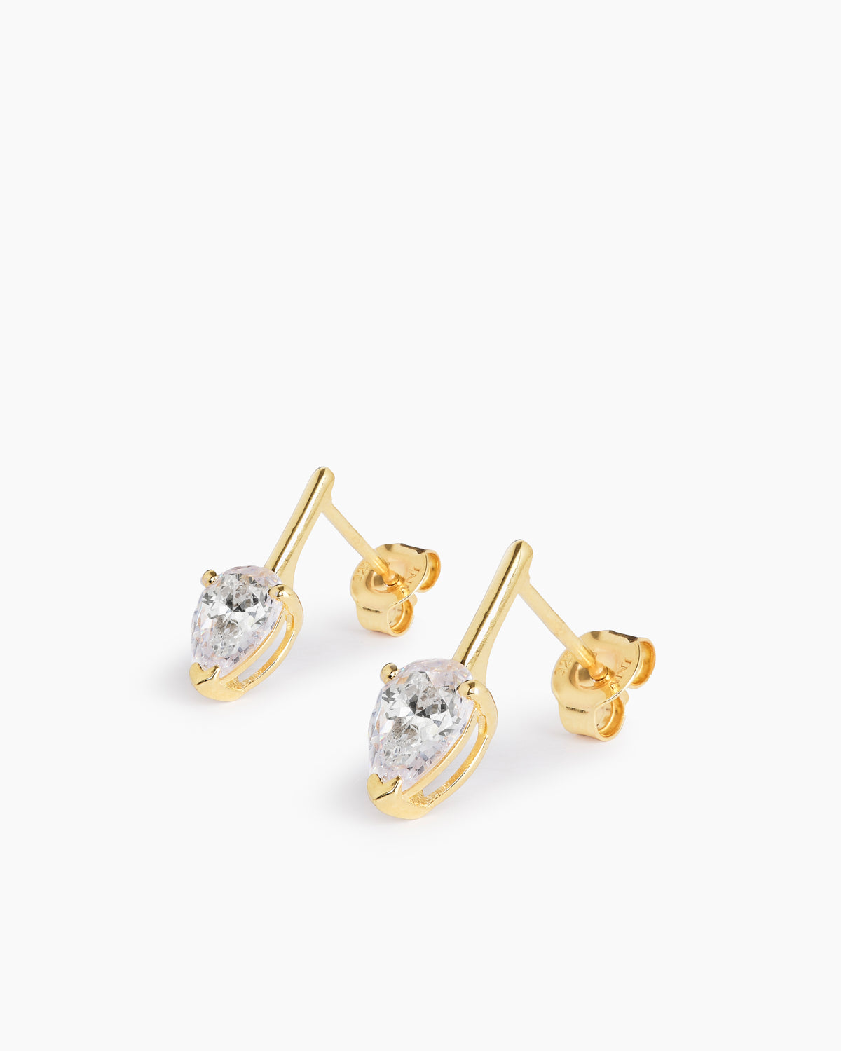 Elegant earrings featuring a pear-shaped cubic zirconia stone that hangs delicately from a polished metal setting. Crafted in 925 sterling silver and available with rhodium plating or 14k gold plating, these earrings are perfect to wear alone or styled with other pieces