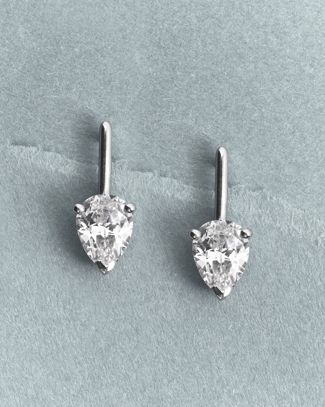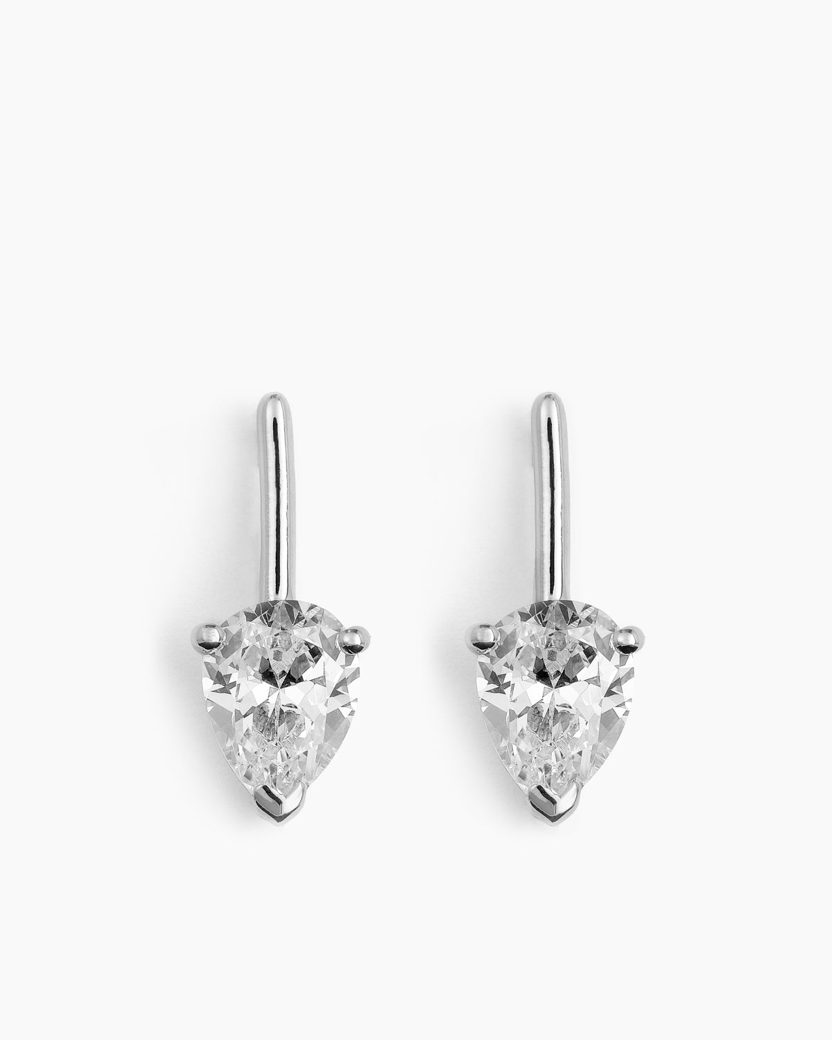 Elegant earrings featuring a pear-shaped cubic zirconia stone that hangs delicately from a polished metal setting. Crafted in 925 sterling silver and available with rhodium plating or 14k gold plating, these earrings are perfect to wear alone or styled with other pieces